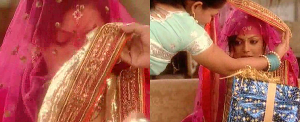 As the newlywed couple arrives, the ladies of the groom's family performs an aarti and showers them with akshat and flowers. The groom's sister places a copper vessel filled with rice, a plate of alta (a red colored water) and two cane baskets. The bride gently pushes the rice-vessel with her right foot, which she then places on the plate of alta. She then places her left foot on the plate. Finally, she places both her feet in the cane baskets and is led to her kohwar (bedroom). Meanwhile, the groom is made to pay cash to his sister to gain entry to the house with his new bride.