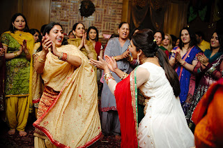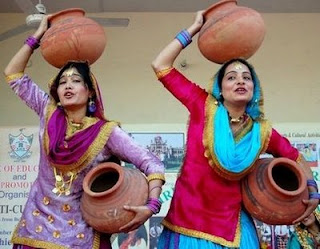 The swinging and twisting the body, shaking the shoulders while bending knees make this dance distinguishable from other dance forms. One can identify Giddha when they see the women clapping their hands during the dance performance. Clapping is one of the prominent features of this dance form. The movement of legs is also a feature of this dance form. The dancers enact verses called bolis, which represent folk poetry at its best. This dance exhibits teasing, fun and exuberance of Punjabi life. These bolis are based on different emotional subjects like arguments, humorous, teasing, love, nature and various topics. This dance can be also theme based i.e some talk about love affairs to the loneliness of a bride separated from her groom. Two or three women form a group and perform these acts by coming in the centre of the circle. Mimicry is also very popular in Giddha. One girl may play the aged bridegroom and another his young bride; or one may play a quarrel-some sister-in-law and another a humble bride. In this way Giddha provides for all the best forum for venting of one's emotions. Giddha dance incorporate village life scenes of woman spinning cotton, fetching water from the well, grinding, etc. This is accompanied with appropriate boli and songs.