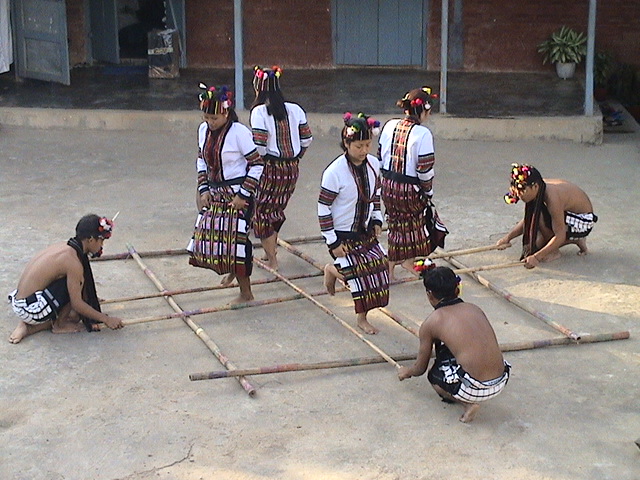One of the peculiar features of the dance is that bamboo sticks are used during the performance. That’s why it is also known as the Bamboo Dance. Both men and women participate in the performance. The men have the duty of holding and tapping the bamboo sticks on the ground. They are sitting on the ground in horizontals lines. The women dancers step alternatively in and out from between and across a pair of flat bamboos. The dance moves and the stepping have different variations. The stepping is an intimation of the movements of birds and the swaying of trees.