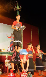 Kham which is actually a drum with skin surfaces on both the sides is used for the music. Another instrument used is the sumui. As the music instruments used are a simple one so as the songs sung by the gents. The lyrics of the songs are very simple and they have no relation with the dance going on the stage. *