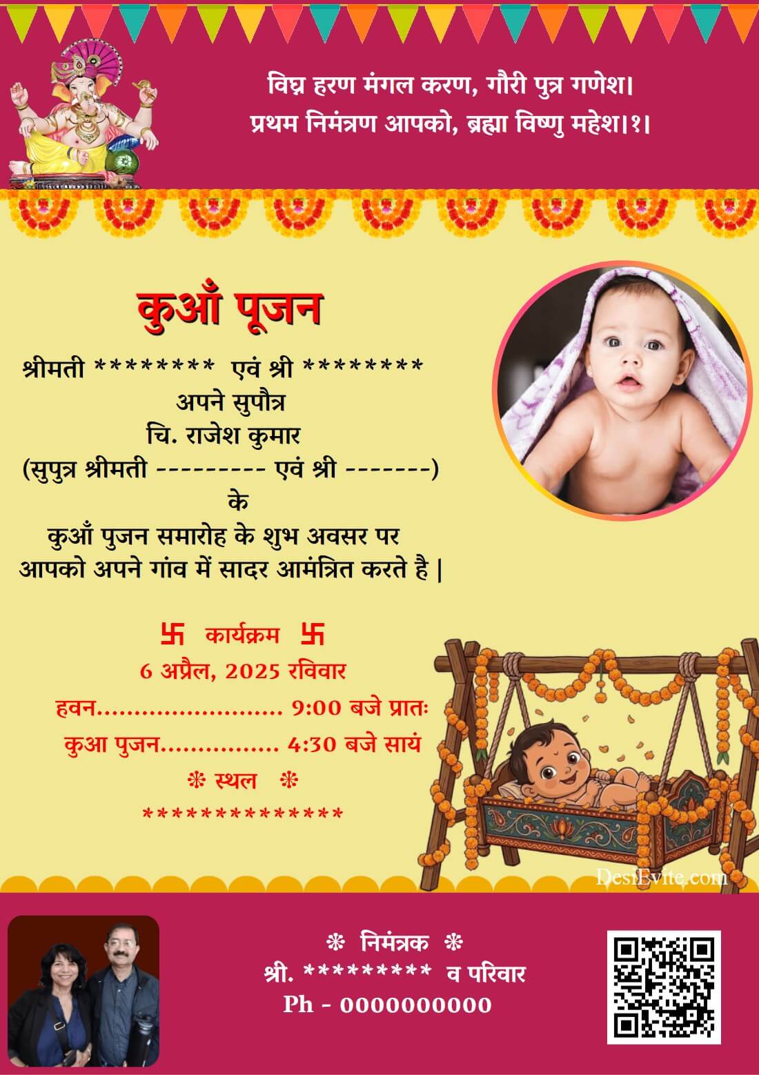 श्रीमती ******** एवं श्री ******** अपने सुपौत्र चि. राजेश कुमार (सुपुत्र श्रीमती --------- एवं श्री -------) के कुआँ पुजन समारोह के शुभ अवसर पर आपको अपने गांव में सादर आमंत्रित करते है |