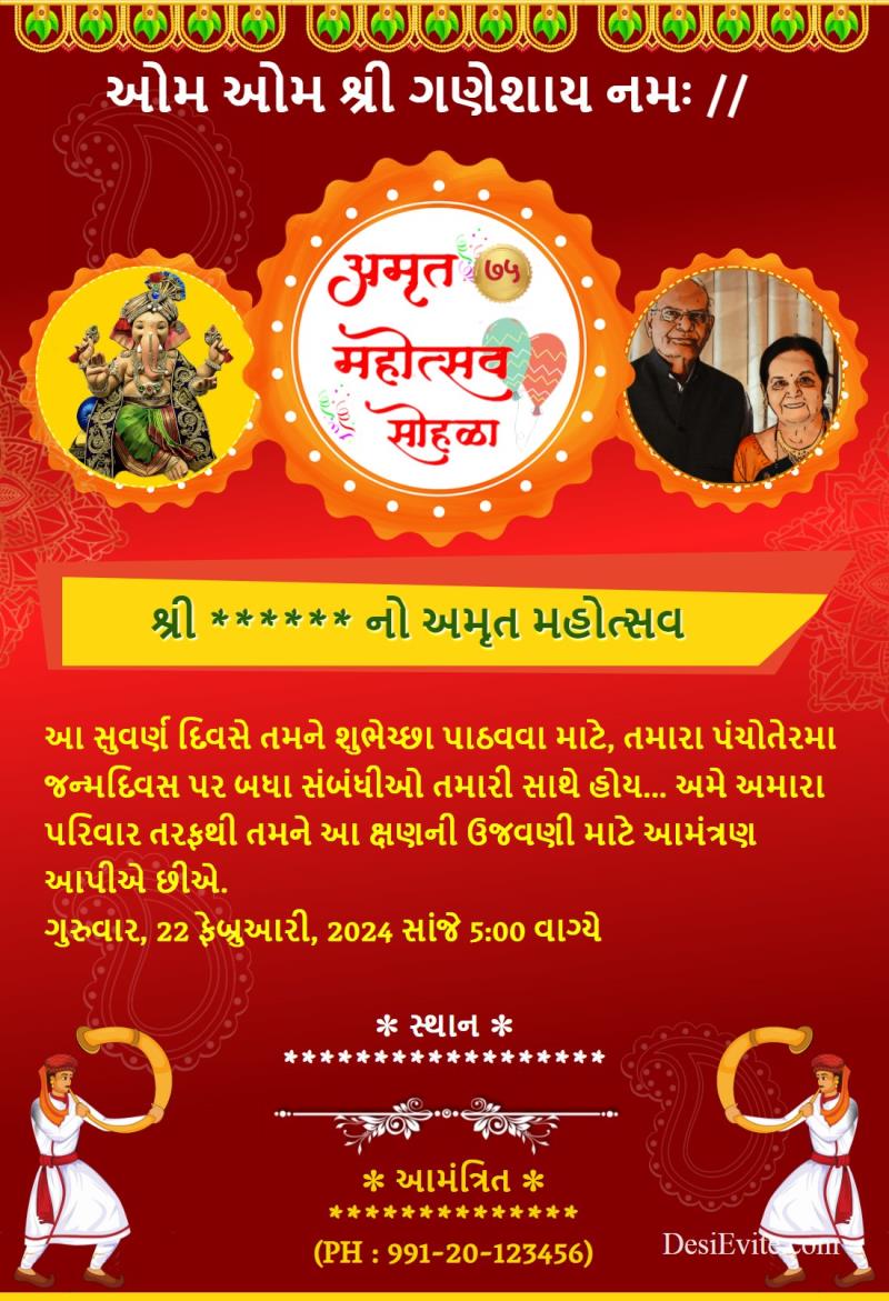Gujarati ७५ वा अमृतमहोत्सव ecard , 75th birthday invitation ecard. traditional hindu birthday celebration