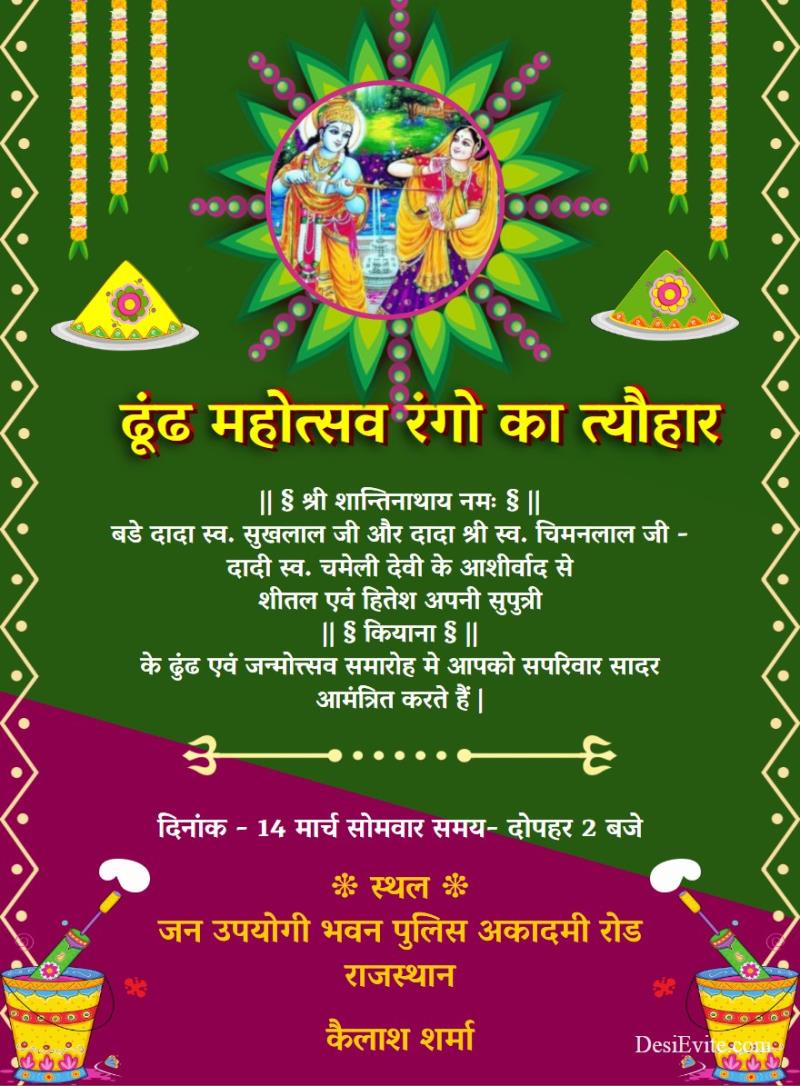|| § श्री शान्तिनाथाय नमः § || बडे दादा स्व. सुखलाल जी और दादा श्री स्व. चिमनलाल जी - दादी स्व. चमेली देवी के आशीर्वाद से शीतल एवं हितेश अपनी सुपुत्री || § कियाना § || के ढुंढ एवं जन्मोत्त्सव समारोह मे आपको सपरिवार सादर आमंत्रित करते हैं |