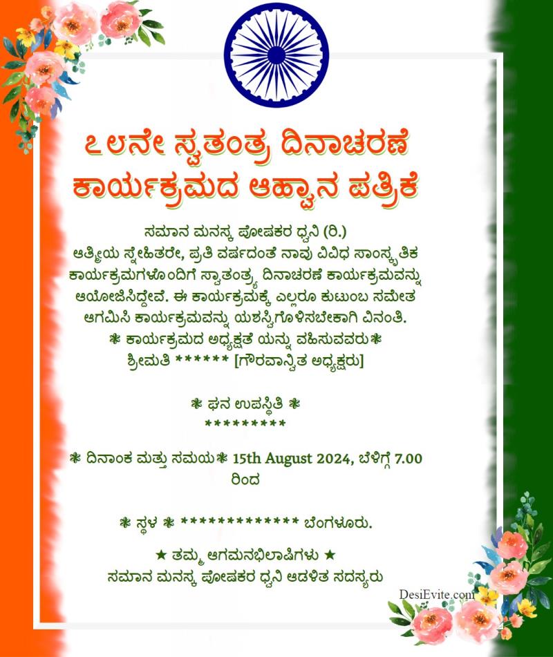 ಸಮಾನ ಮನಸ್ಕ ಪೋಷಕರ ಧ್ವನಿ (ರಿ.) ಆತ್ಮೀಯ ಸ್ನೇಹಿತರೇ, ಪ್ರತಿ ವರ್ಷದಂತೆ ನಾವು ವಿವಿಧ ಸಾಂಸ್ಕೃತಿಕ ಕಾರ್ಯಕ್ರಮಗಳೊಂದಿಗೆ ಸ್ವಾತಂತ್ರ್ಯ ದಿನಾಚರಣೆ ಕಾರ್ಯಕ್ರಮವನ್ನು ಆಯೋಜಿಸಿದ್ದೇವೆ. ಈ ಕಾರ್ಯಕ್ರಮಕ್ಕೆ ಎಲ್ಲರೂ ಕುಟುಂಬ ಸಮೇತ ಆಗಮಿಸಿ ಕಾರ್ಯಕ್ರಮವನ್ನು ಯಶಸ್ವಿಗೊಳಿಸಬೇಕಾಗಿ ವಿನಂತಿ. ❃ ಕಾರ್ಯಕ್ರಮದ ಅಧ್ಯಕ್ಷತೆ ಯನ್ನು ವಹಿಸುವವರು❃ ಶ್ರೀಮತಿ ****** [ಗೌರವಾನ್ವಿತ ಅಧ್ಯಕ್ಷರು]