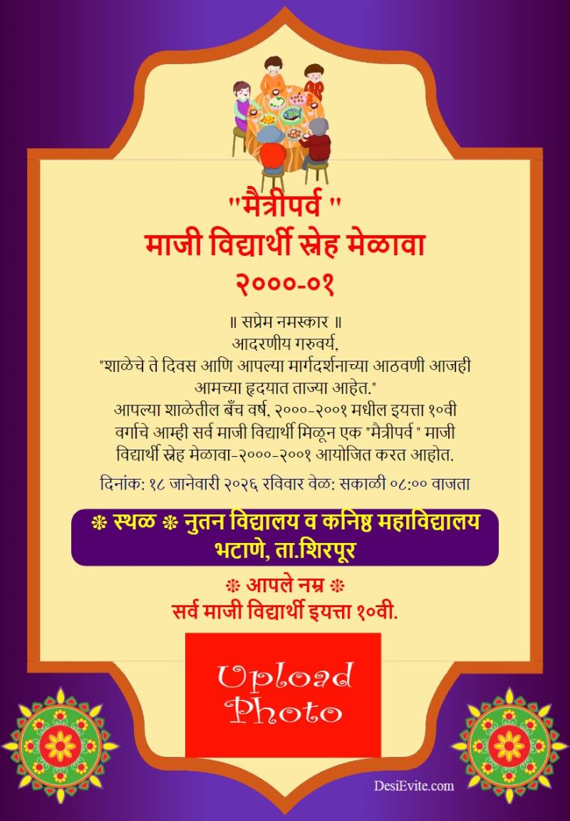 ॥ सप्रेम नमस्कार ॥ आदरणीय गरुवर्य, "शाळेचे ते दिवस आणि आपल्या मार्गदर्शनाच्या आठवणी आजही आमच्या हृदयात ताज्या आहेत." आपल्या शाळेतील बँच वर्ष, २०००-२००१ मधील इयत्ता १०वी वर्गाचे आम्ही सर्व माजी विद्यार्थी मिळून एक "मैत्रीपर्व " माजी विद्यार्थी स्नेह मेळावा-२०००-२००१ आयोजित करत आहोत.