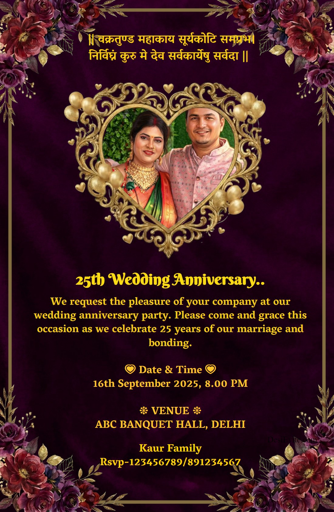 We request the pleasure of your company at our wedding anniversary party. Please come and grace this occasion as we celebrate 25 years of our marriage and bonding.