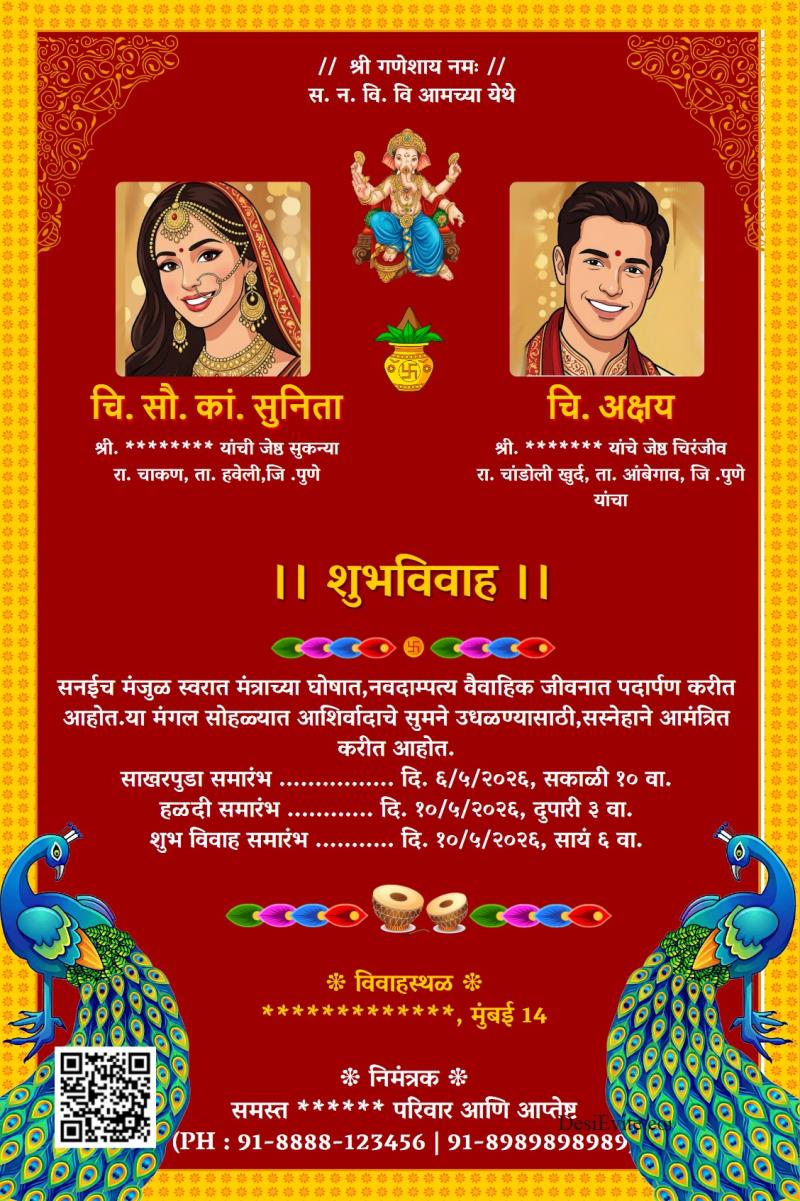 Marathi wedding invitation eard with indian peacock theme 132