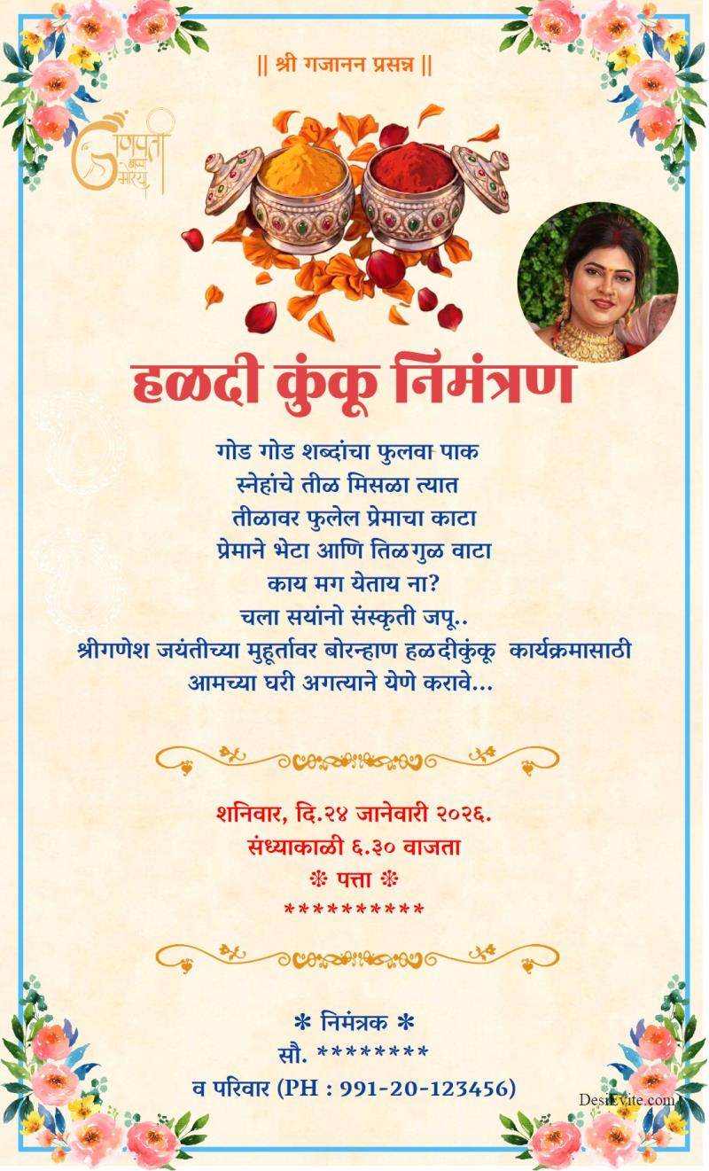 Haldi kumkum invitation ecard in marathi font or Haldi kumkum invitation ecard template in marathi