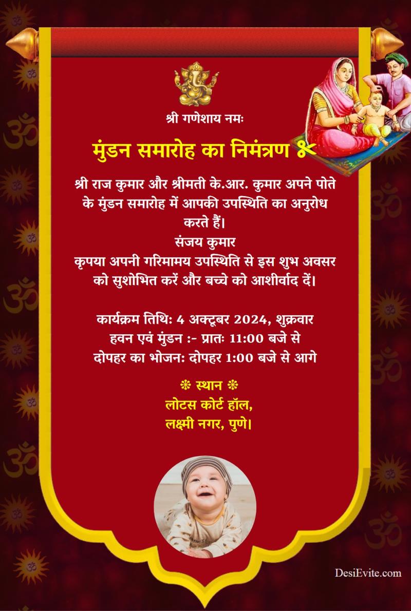 श्री राज कुमार और श्रीमती के.आर. कुमार अपने पोते के मुंडन समारोह में आपकी उपस्थिति का अनुरोध करते हैं। संजय कुमार कृपया अपनी गरिमामय उपस्थिति से इस शुभ अवसर को सुशोभित करें और बच्चे को आशीर्वाद दें।