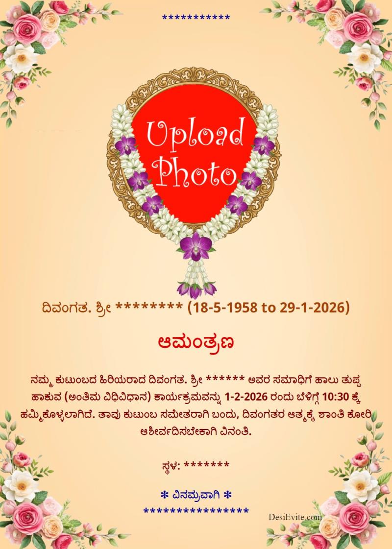 ನಮ್ಮ ಕುಟುಂಬದ ಹಿರಿಯರಾದ ದಿವಂಗತ. ಶ್ರೀ ****** ಅವರ ಸಮಾಧಿಗೆ ಹಾಲು ತುಪ್ಪ ಹಾಕುವ (ಅಂತಿಮ ವಿಧಿವಿಧಾನ) ಕಾರ್ಯಕ್ರಮವನ್ನು 1-2-2026 ರಂದು ಬೆಳಿಗ್ಗೆ 10:30 ಕ್ಕೆ ಹಮ್ಮಿಕೊಳ್ಳಲಾಗಿದೆ. ತಾವು ಕುಟುಂಬ ಸಮೇತರಾಗಿ ಬಂದು, ದಿವಂಗತರ ಆತ್ಮಕ್ಕೆ ಶಾಂತಿ ಕೋರಿ ಆಶೀರ್ವದಿಸಬೇಕಾಗಿ ವಿನಂತಿ.